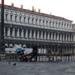Einen Weg, den Touristenmassen zu entgehen, finden wir – früh am Morgen (sehr früh, beinahe noch nachts, gegen 5:30 Uhr) aufstehen und gen Markusplatz, einige aufgeschreckte Tauben, Dunst über der Lagune, die Massen an weißen Caféhausstühle stehen noch feinsortiert und unbenutzt – Ruhe, kein Trubel, (fast) keine Menschen. (Ein weiterer Weg: spät am Abend, wenn viele Touristen wieder zu ihren Hotels auf dem Festland zurück gekehrt sind.)