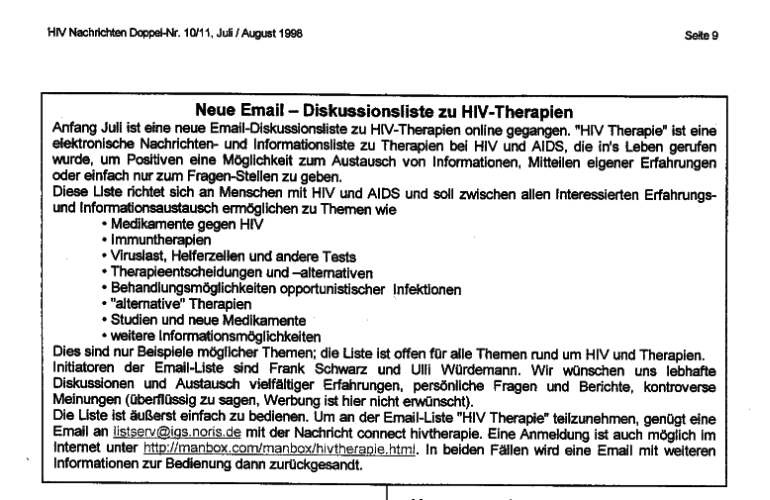 „Anfang Juli [1998] ist eine neue Email-Diskussionsliste zu HIV-Therapien online gegangen. „HIV-Therapie“ ist eine elektronische Nachrichten- und Informationsliste zu Therapien bei HIV und Aids, die in’s Leben gerufen wurde, um Positiven eine Möglichkeit zum Austausch von Informationen, Mitteilen eigener Erfahrungen oder einfach nur zum Fragen-Stellen zu geben.