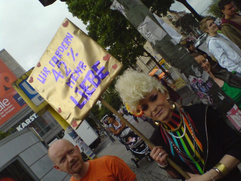 – Eine Parade zudem, seltsam sinnentleert, die ihren Zweck erst zu suchen scheint. Nur geringfügig ‘um-dekorierte’ Karnevals-Wagen verstärken nicht nur bei so manchem heterosexuellen Parade-Besucher den Eindruck, hier ziehe doch ein netter spaßiger Sommer-Karneval vorbei. Kamelle, Strüsscher [‚Bonbons, Blumensträuße‘ – für die Auswärtigen], nur im Sommer halt …