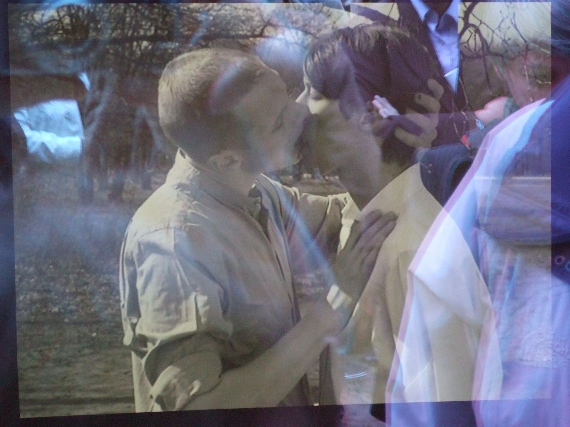 15:35 „Was ist das?“, höre ich die kleine Tochter fragen. „Ein Fenster,“ erklärt der Vater, und die Tochter schaut ihn ungläubig an. „Dahinter küssen sich zwei Männer.“ Das Töchterchen ist ruhig. Sein Sohn wird jetzt regsam. „Das ist aber komisch,“ protestiert er, „zwei küssende Männer!“. Der Junge mag vielleicht 5, 6 Jahre alt sein. „Da ist nichts dran komisch“, der Vater nimmt den Jungen bei der Hand. „Aber warum küssen sich denn die zwei Männer in dem Kasten?“, hakt Sohnemann nach. Vater ist ruhig und geduldig, erklärt ihm „Schau, das ist ein Denkmal. Das soll daran erinnern, dass Schwule von den Nazis umgebracht wurden.“
