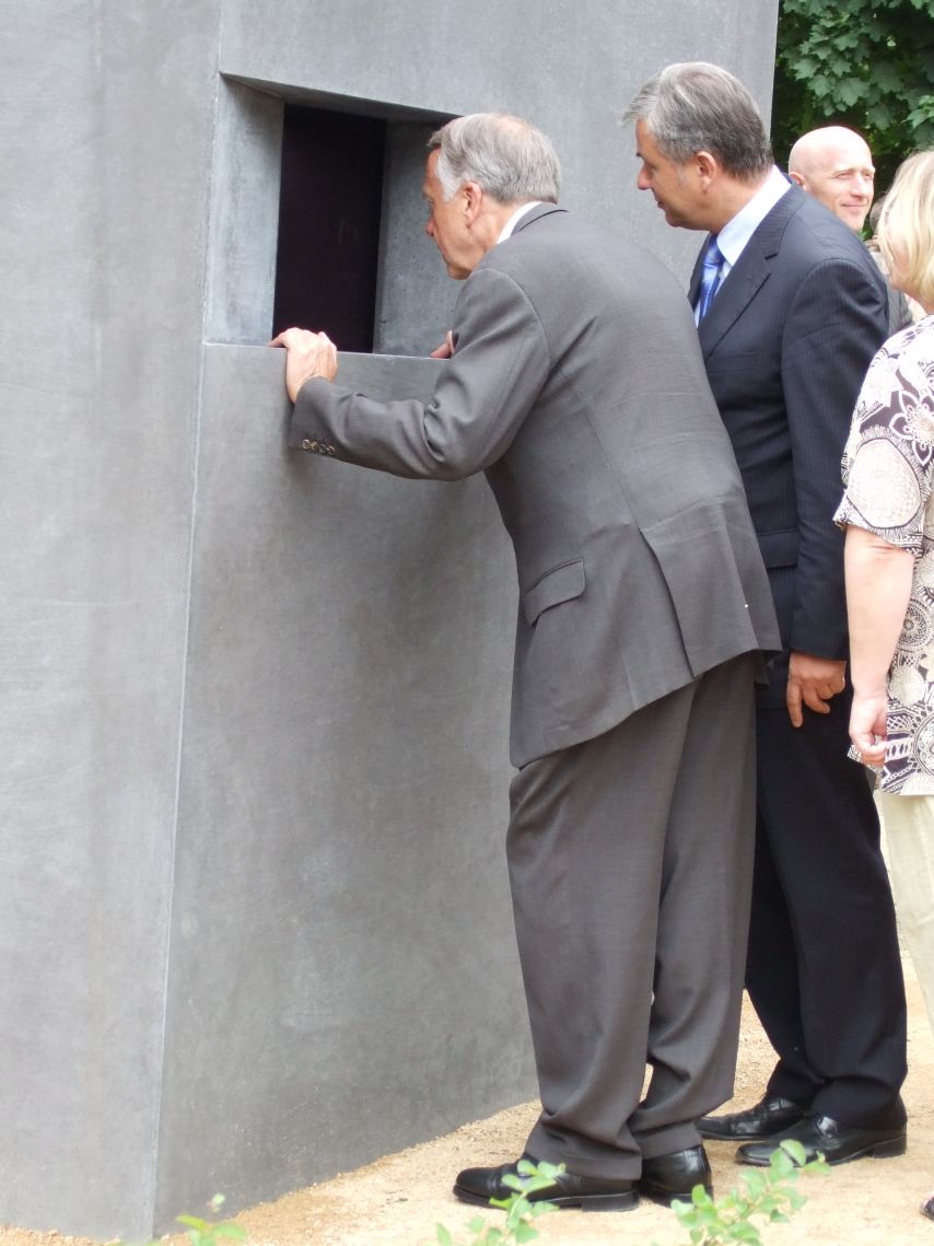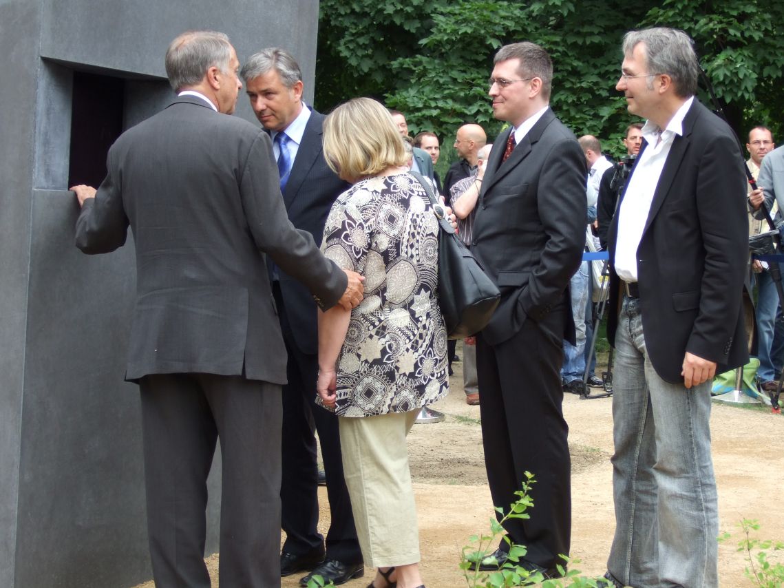 16:21 Eine kleine Gruppe Radler weckt mein Interesse. Vermeintlich fotografierend lausche ich ein wenig. „Na Ilse, wat ist det, mein Schatz?“ Ein in eine (zu) enge Radlerhose gezwängter Mittvierziger fragt seine unsicher dreinschauende Frau. „Ich weiß nicht?“ Sie ist ahnungslos, schaut in das Guckloch, schaut ihren mann an. „Das ist das Mahnmal für die Schwarzseher,“ plappert ihre Nachbarin? Freundin? Kollegin? ungefragt dazwischen, „sieh’ste nicht da unten das GEZ-Schild?“ Die angesprochene schaut tatsächlich nach unten, ist irritiert nichts zu finden. Gelächter. „“Det ham wa inne Abendschau jesehn, erinnerste dir? Det is doch det Mahnmal für die Schwulen. Weisste, Anfang der Woche war doch der jroße Bericht inne Glotze.“ Aha-Effekt, strahlend schaut sie ihn an. „Komm, vorn is det Schild, schaun wa uns noch an.“