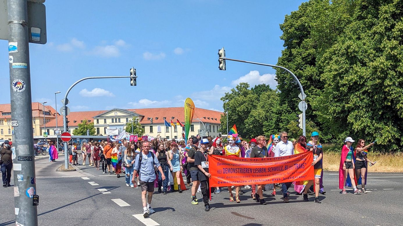 CSD Oldenburg – hier demonstrieren Lesben, Schwule, Bi und TransDu musst nicht extra hochsehen! Schwule und Lesben sind deine Nachbar*innen – CSD Oldenburg 2025